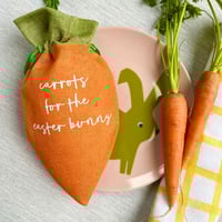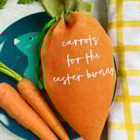 Each beautiful linen carrot bag has a drawstring perfect for securing all those sweet treats. Featuring the wording 'carrots for the easter bunny'