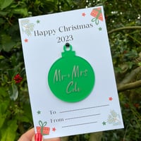 An acrylic tree decoration in the shape of a circle with message 'happy Personalised Christmas Decoration attached to open card with 'Happy Christmas 2023' Perfect token bauble gift to celebrate Christmas this year.