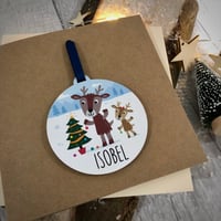 A fantastic card with personalised wooden Reindeer bauble perfect for a special keepsake Christmas Card which can also be sent direct!